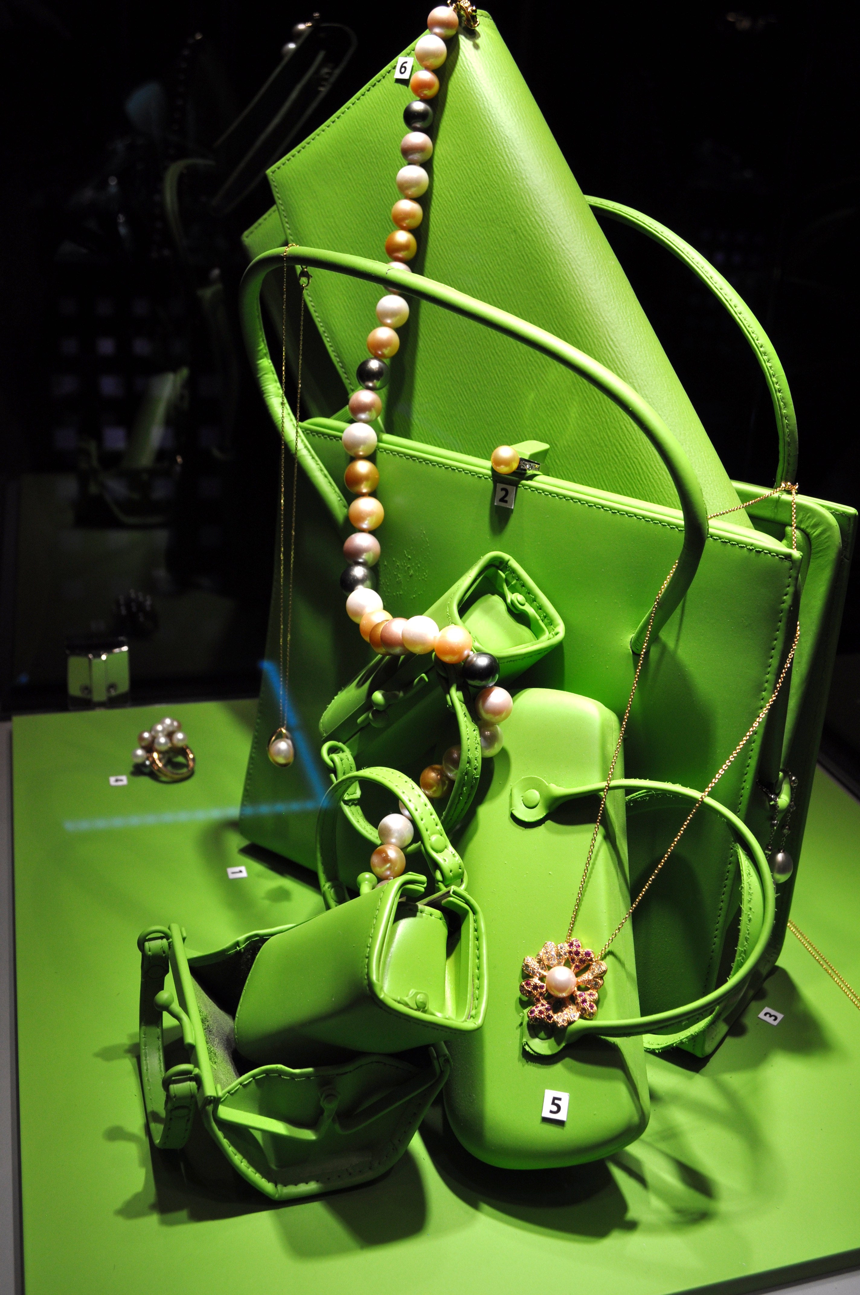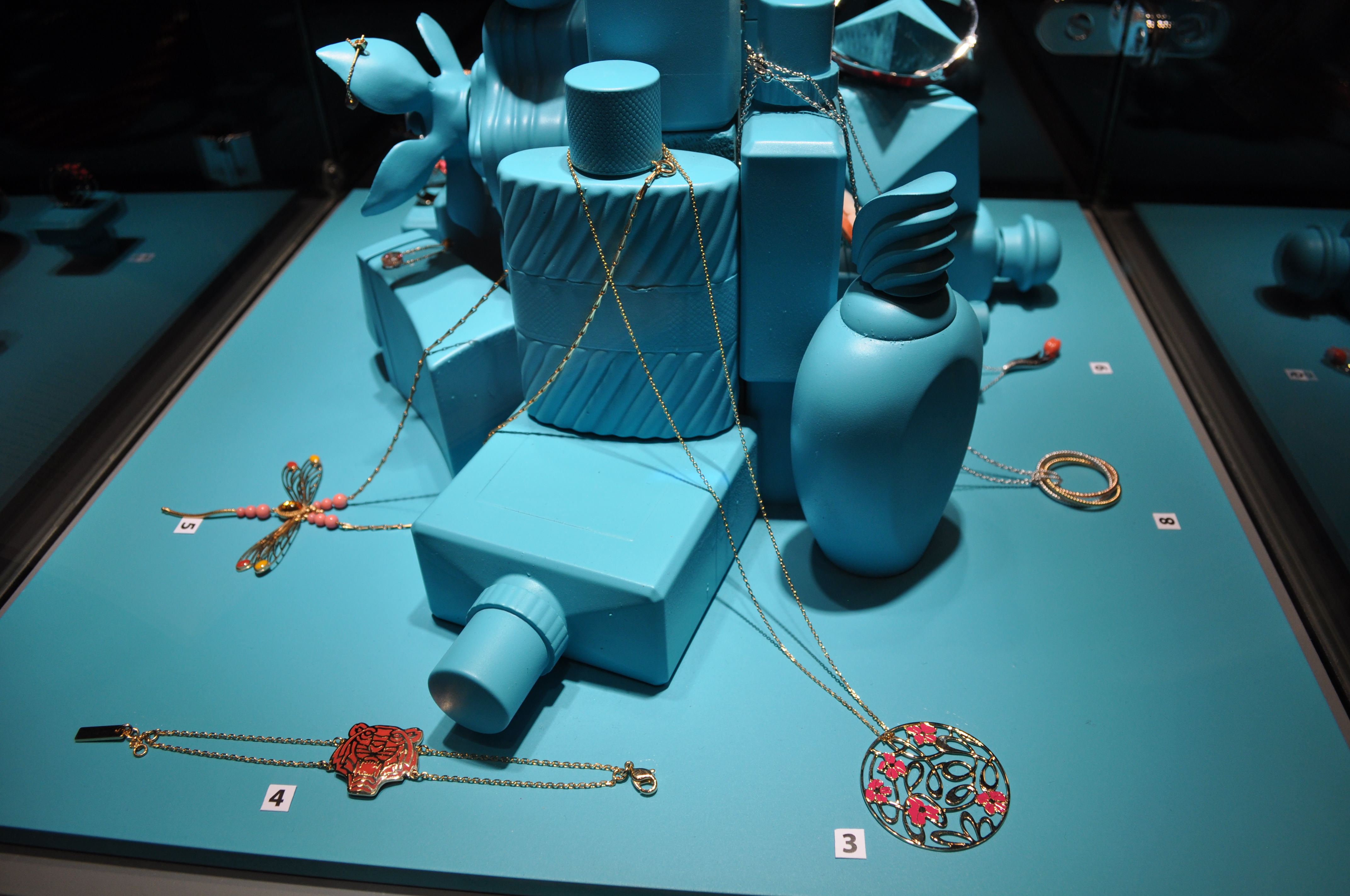 Dès l’accueil, l’ambiance est tamisée, le jeu de couleurs tranche avec le noir des tentures, et les bulles de champagne pétillent… Mais mon attention est ailleurs : je ne sais plus où donner de la tête tant les vitrines me paraissent plus belles les unes que les autres ! J’ai adoré le concept, qui joue sur l’opposition du cercle chromatique : les pierres violettes comme les améthystes sont mises en valeur sur un support jaune, les bijoux corail sur du bleu, etc… Chaque vitrine forme un ensemble à la fois homogène et vivant qui fait la part belle aux bijoux.